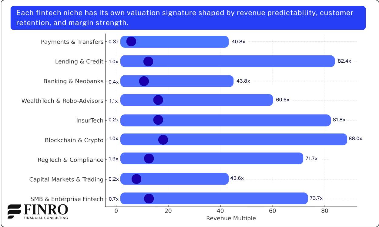 Valuation differences are structural: Fintech niches behave differently due to revenue quality, margin depth, and customer durability, which drive significant divergence in revenue multiples.