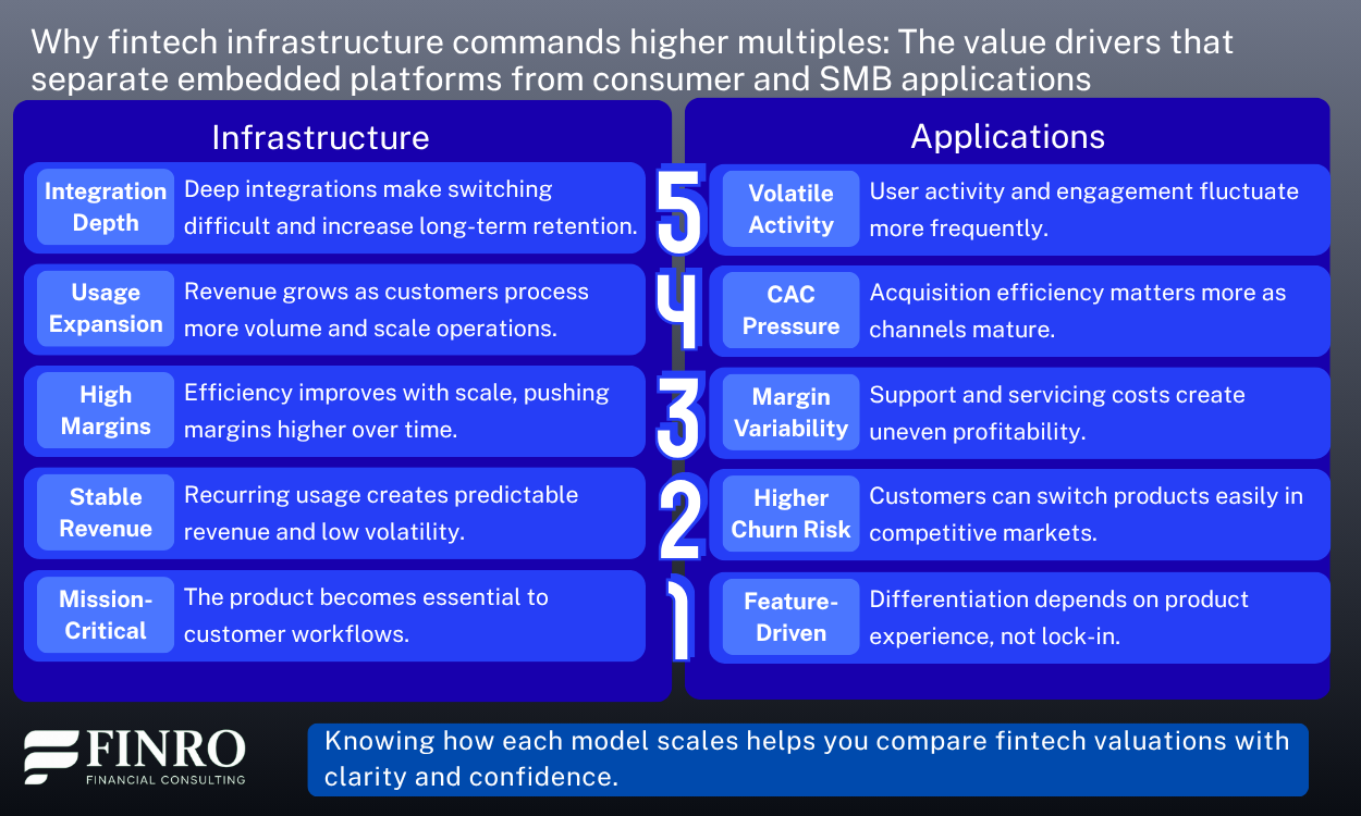 In the previous section, we broke fintech into two distinct engines of growth: infrastructure, which scales with customer usage, and applications, which scale with acquisition and retention.