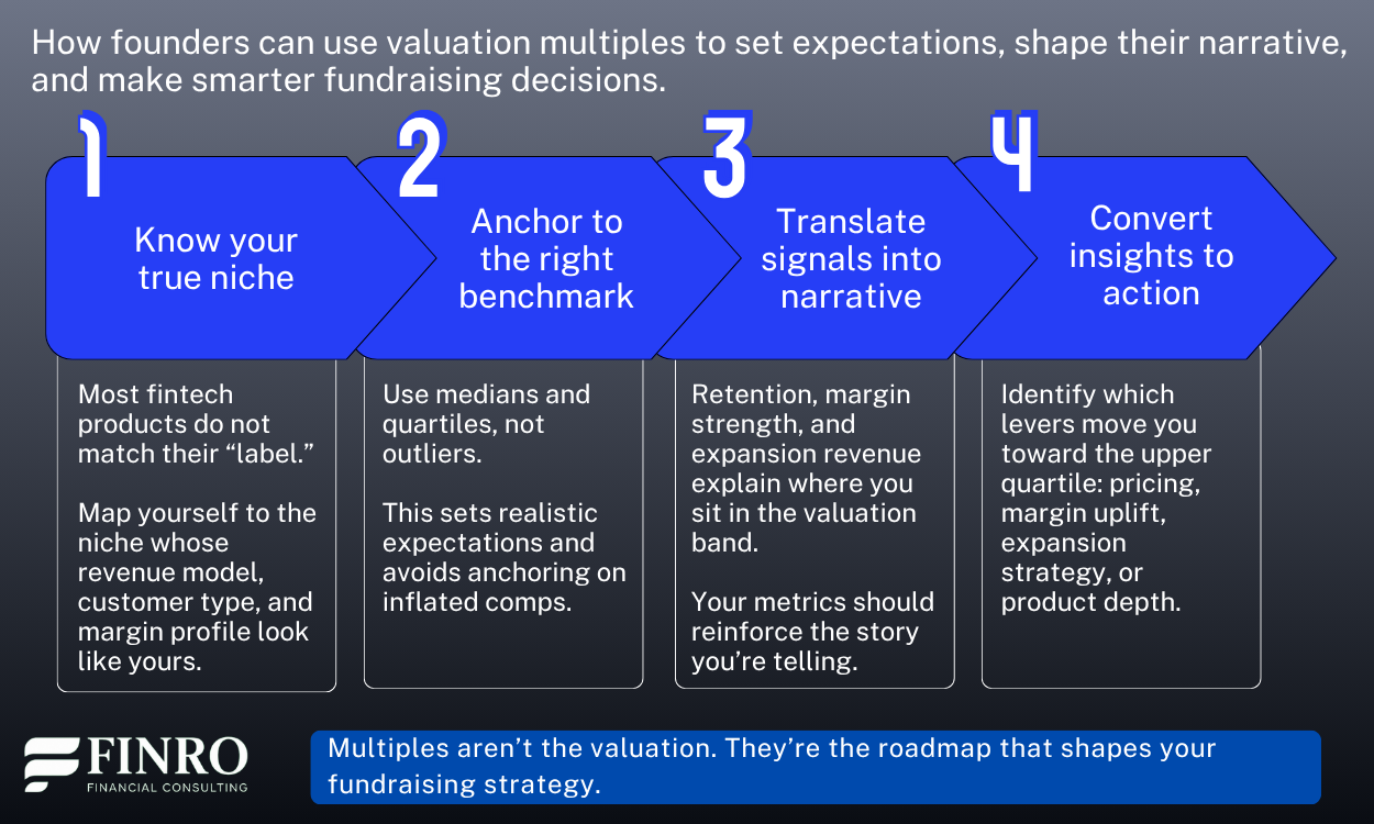 You’ve seen how different fintech niches behave, how their multiples move, and which business models command a premium. Now the question becomes practical: What should a founder actually do with all of this? Multiples are not academic. They shape investor expectations, signal what “good” looks like in your category, and influence how you position your company when you raise.