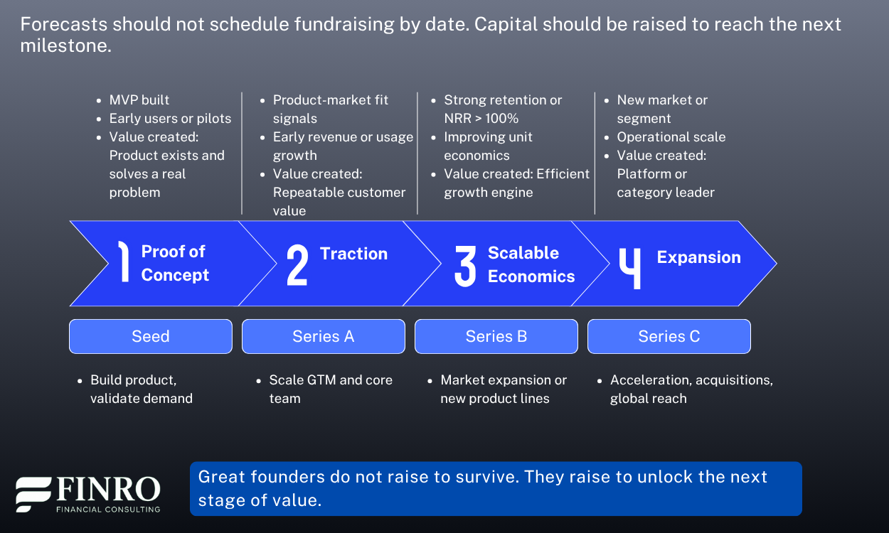 Instead of raising by date, align fundraising with milestones that prove traction, improve valuation, and unlock the next stage of growth.