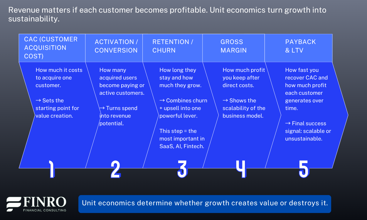2. Unit economics, including CAC, LTV, churn, margin, and payback, determine whether growth creates value or accelerates burn.