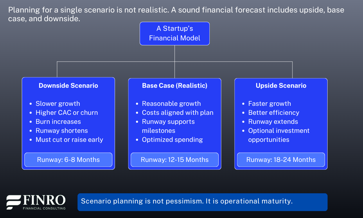 Many founders build a single forecast and treat it as the truth. They model “the plan” with perfect execution, stable pricing, on-time hiring, and smooth growth.