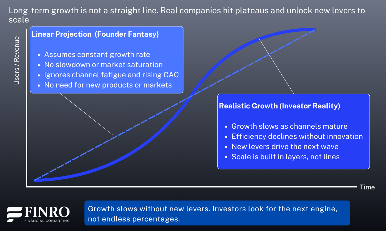 Even great companies experience plateaus or must unlock new channels, markets, or products to maintain momentum. When a forecast shows endless acceleration, investors see a founder who has not thought through scale.